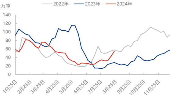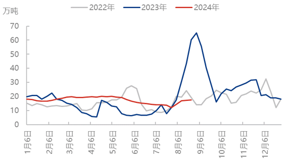 截至2024年8月21日,中国尿素企业总库存量55.05万吨,较上周增加11.33万吨,环比增加25.91%。本周期国内尿素企业继续大幅累库,近期尿素价格持续下行跌破今年前低,市场心态悲观,刚需推动不足,企业库存压力逐渐增加。