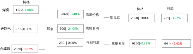 本周期产业链利润涨跌不一。尿素价格走低之下利润空间收窄;合成氨利润稍有回弹;复合肥利润窄幅波动;三聚氰胺利润继续增加。