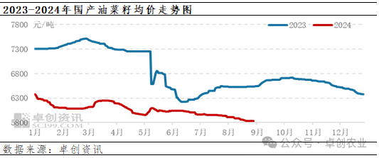 8月份国内油菜籽市场依然处于消费淡季,南方地区气温较高,下游油坊开工时间较短,叠加国产菜籽油和国产菜粕库存不断积压,因此商家对油菜籽采购量不大,导致多数贸易商走货速度缓慢。虽然今年南方新季油菜籽整体产量下降,但是由于消化速度缓慢,因此目前南方多数地区油菜籽剩余量较大。随着其他新季农产品上市,贸易商对油菜籽出货积极性升高,不断通过降价来吸引下游商家拿货,但是油菜籽成交量依然不大。