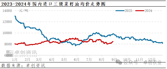 8月份国内进口菜籽油现货价格整体呈现先跌后涨走势,均价环比下跌。截至8月28日,本月各地区进口三级菜籽油均价为8224元/吨,较上月下跌438元/吨,跌幅为5.06%。8月份国内进口菜籽油现货价格有所下跌,主要原因在于:1、国际市场利空因素增多。2、国内下游市场菜籽油备货量不大。