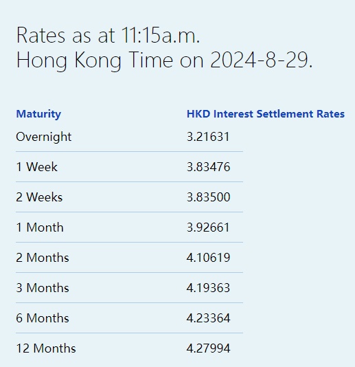 8月29日,一个月以下港元拆息全线上升,其中,隔夜拆息结束八连跌,升14基点至3.21631%,而与楼按相关的一个月拆息亦中止九连跌,升至3.92661%,为8月26日以来最高。