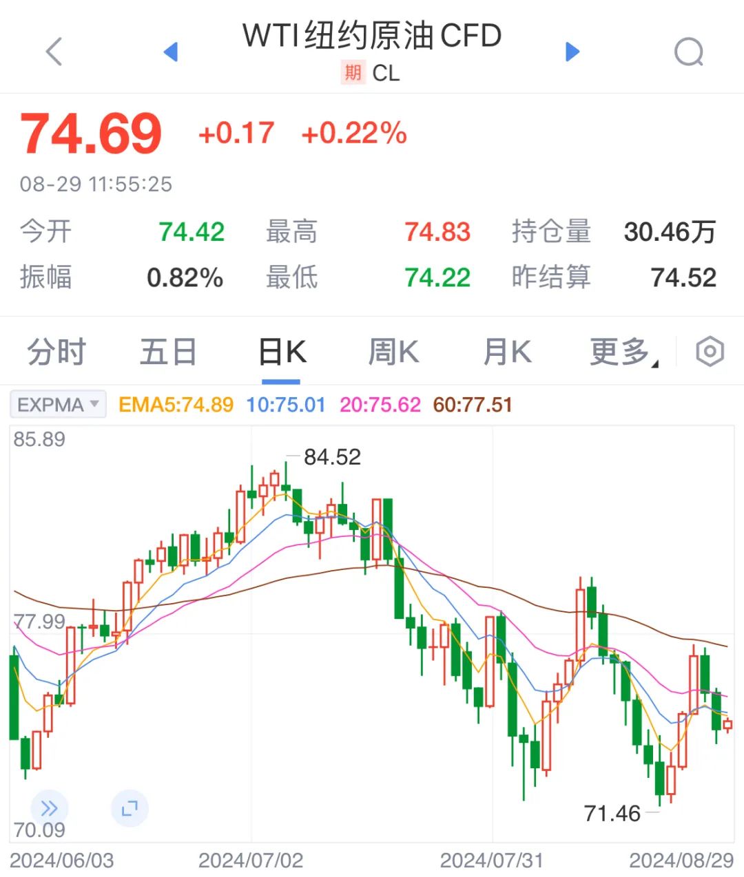 8月28日,需求担忧抵消利比亚供应风险,EIA原油库存降幅不及预期,国际油价收盘续跌。纽约商品期货交易所WTI10月原油即期合约收盘下跌1.01美元/桶,至74.52美元/桶,跌幅1.34%。洲际交易所布伦特10月原油即期合约收盘下跌0.9美元/桶,至78.65美元/桶,跌幅1.13%。上海原油价格夜盘下跌,主力期约SC2410以551.8元/桶收盘,下跌10.3元/桶,跌幅1.83%。
