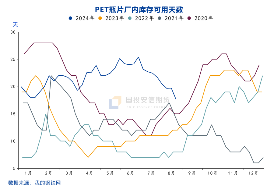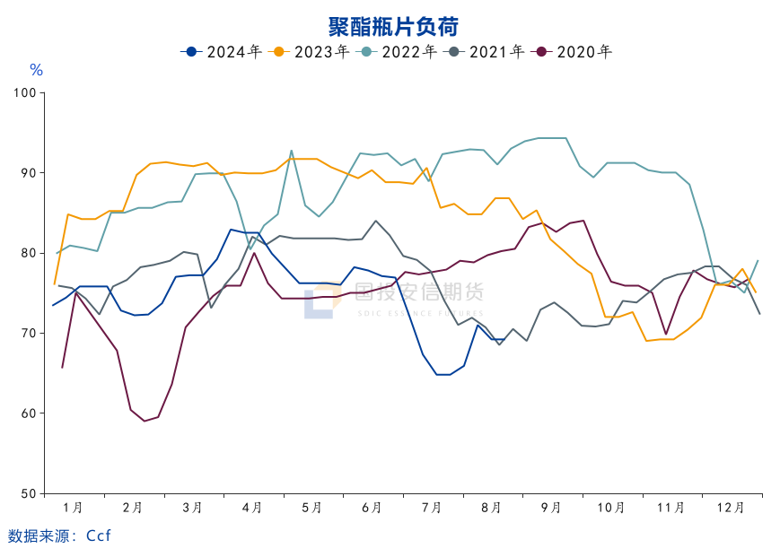 瓶片的厂内库存天数往往具有明显的季节性,每年春节前后及11月前后最高,5-8月份处于年内低位,对应的是软饮料生产的季节性。2024年二季度,国内瓶片企业库存并未出现季节性下滑,而是自春节前后的高位持续攀升,直至7月份之后随着行业的开工下降才逐渐下滑,目前瓶片企业的库存依旧处于近5年同期的偏高水平。后市,随着新产能投放及检修装置的重启,瓶片库存有继续上升的预期。