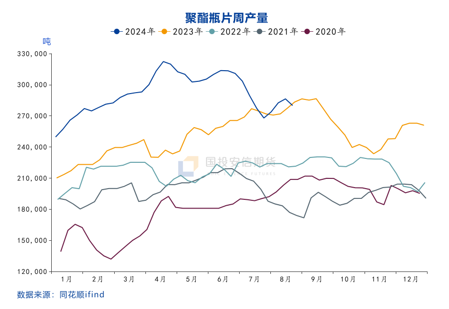 2023年以来,国内瓶片新产能集中投产,当年产能新增430万吨,增速达到35%;2024年1-7月产能增加240万吨,后市还有360万吨计划新产能,近期可能投产的有逸盛海南60万吨,三房巷75万吨及仪征50万吨,以上装置完成投产后,国内瓶片产能将达到2128万吨,产能增速将达到28%。高投产对瓶片市场带来较大的供应压力,预期瓶片产量将再回升势。