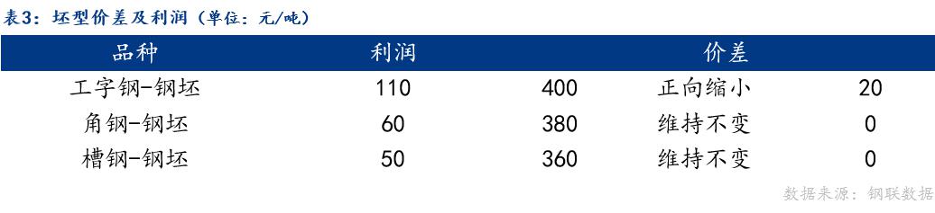 从坯型价差来看,给工字钢与钢坯价差正向缩小;角钢、槽钢与钢坯价差维持不变。