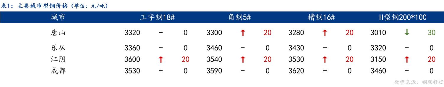 今日型钢主流价格稳中偏强调整,唐山工字钢、角钢、槽钢价格较上一交易日稳中上涨20元/吨,H型钢价格下跌30元/吨;乐从工字钢、角钢、槽钢、H型钢价格较上一交易日持平;江阴工字钢、角钢、槽钢、H型钢价格较上一交易日上涨20元/吨;成都工字钢、角钢、槽钢价格较上一交易日持平。