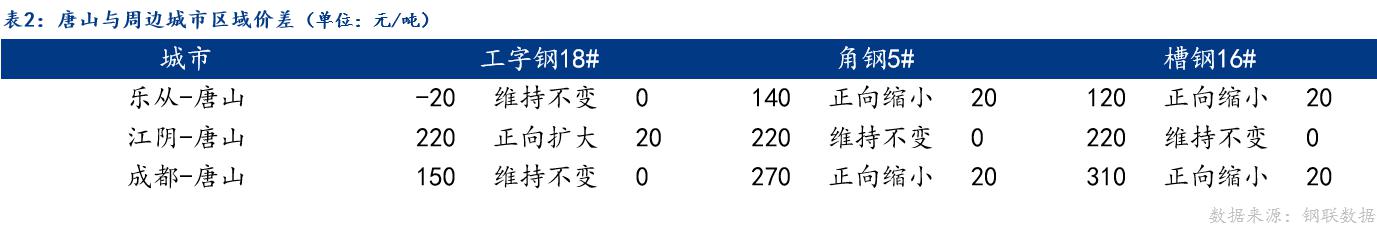 从区域价差来看,乐从工字钢,江阴角钢、槽钢,成都工字钢与唐山价差维持不变;乐从角钢、槽钢,成都角钢、槽钢与唐山价差正向缩小;江阴工字钢与唐山价差正向扩大。