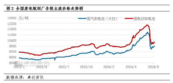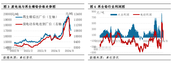 废电瓶作为生产再生铅的主要原材料,是再生铅成本的主要构成部分。由于我国再生铅产能过剩,废电瓶市场处于供不应求状态,供应偏紧推动废电池价格持续上涨,导致再生铅行业成本端不断上移。2022年后我国铅产能快速增长,原料供需矛盾加剧,废电瓶价格更是震荡上行,2023-2024年全国废电瓶含税到厂主流价格走势如图2所示。
