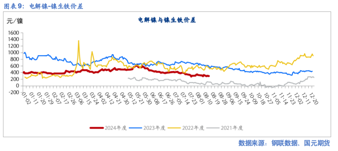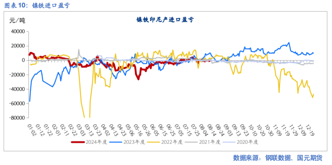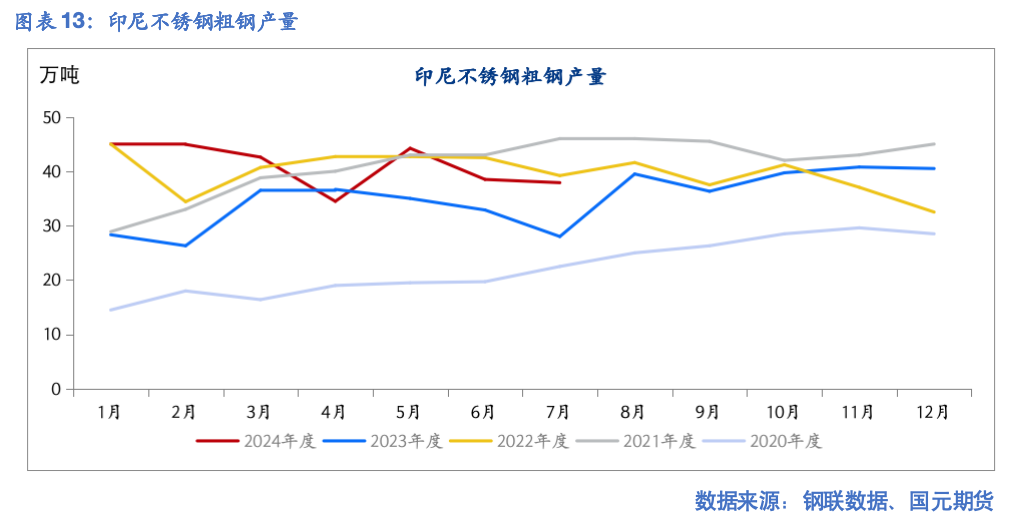 镍铁方面,7月印尼运行产能减少,国内产量回升。据Mysteel调研统计,2024年7月中国&印尼镍生铁实际产量金属量总计14.84万吨,环比增多3.79%。其中中国镍生铁实际产量金属量2.57万吨,环比增加1.93%。价格方面,印尼主要港口镍生铁(13%>Ni>10%)FOB价增加5美元/吨至121美元/吨,成本推动价格上行。7月印尼镍铁回流量级较前期有明显下降,预计印尼镍铁回流量级在65-70万吨。印尼部分地区雨季暂未结束,镍矿供应仍然偏紧,印尼镍铁成本高企。