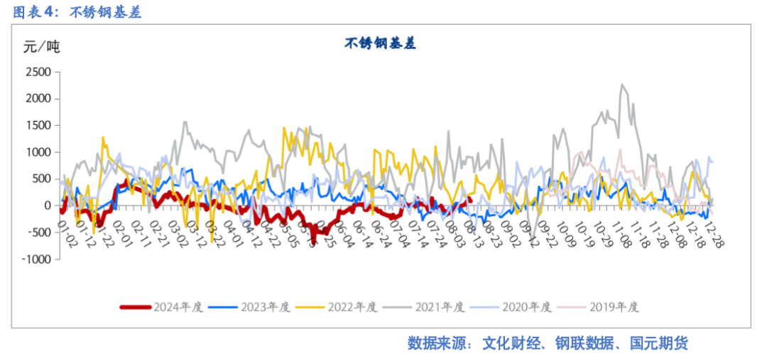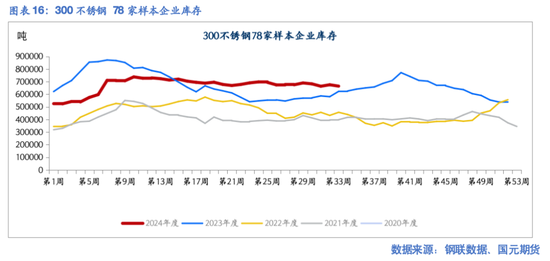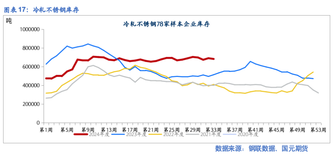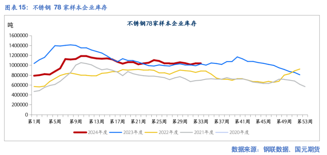 库存维持高位,需求暂无亮点,家电需求季节性走弱。产业在线发布的三大白电排产报告显示:2024年8月空冰洗排产总量合计为2672万台,环比下降11.93%。截至8月16日,78家样本企业不锈钢社会库存为103.22万吨,同比增加0.94%。