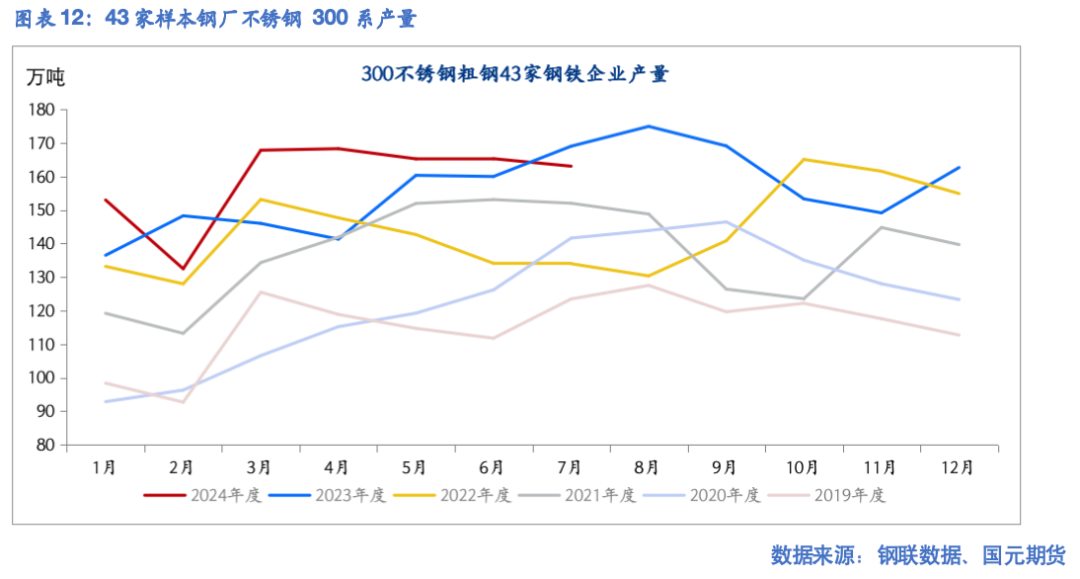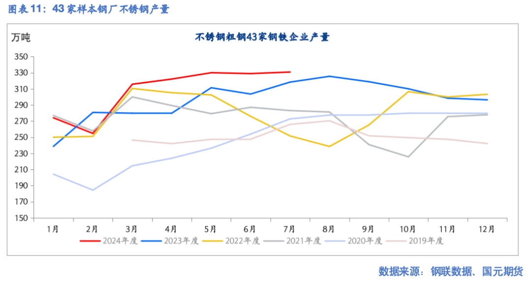不锈钢厂7月产量小幅增加,高于排产计划。钢厂7月粗钢总量为330.83万吨,较排产计划实现6-7万吨的增量。据Mysteel统计,2024年8月国内43家不锈钢厂粗钢排产332.56万吨,月环比略,其中:200系102.02万吨,月环比减少0.2%;300系169.45万吨,月环比增加6.95%。