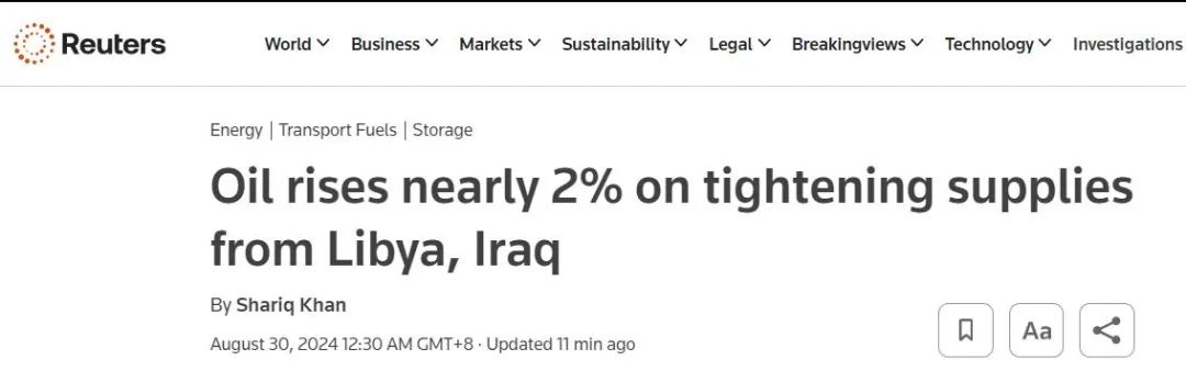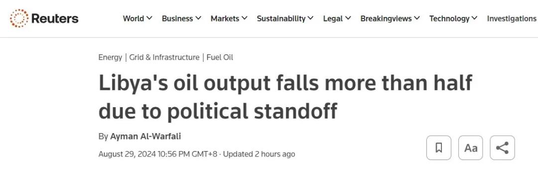黄琛分析称,8月26日,利比亚东部政府在社交平台上发表声明称,所有油田码头和石油设施都面临“不可抗力”。但根据利比亚当地工程师8月29日的消息,位于利比亚oil crescent的港口运作正常,目前还没有接到停止出口的命令。这也说明利比亚并未全部停止出口,据市场估算,利比亚原油出口量可能降至40万桶/日,相较于正常水平减少约70万桶/日,小于此前市场预计的减产117万桶/日。