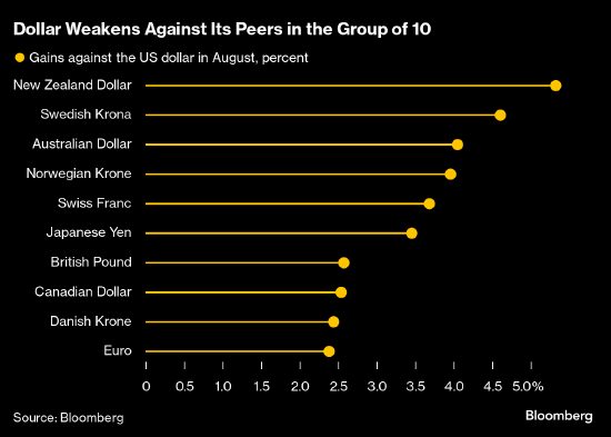 这拉低了美债收益率,并遏制了对美国经济衰退可能导致全球经济陷入停滞的担忧,从而激励交易员进行收益率更高的海外投资。因此,彭博追踪的几乎所有主要货币兑美元本月均上涨,新西兰元和瑞典克朗至少上涨了4%。