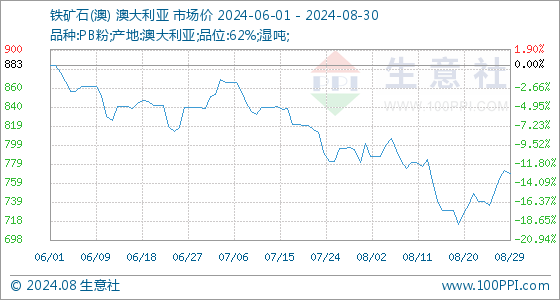 8月30日生意社铁矿石(澳)基准价为769.33元/吨