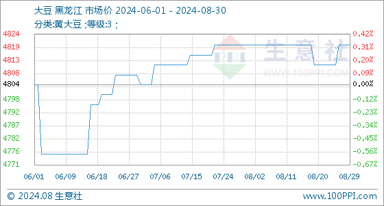 8月30日,生意社大豆基准价为4820.00元/吨,与本月初持平。