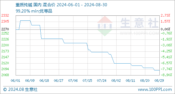 8月30日,生意社重质纯碱基准价为2090.00元/吨,与本月初(2140.00元/吨)相比,下降了-2.34%。