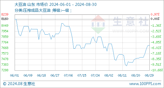 8月30日,生意社大豆油基准价为7714.00元/吨,与本月初(7692.00元/吨)相比,上涨了0.29%。
