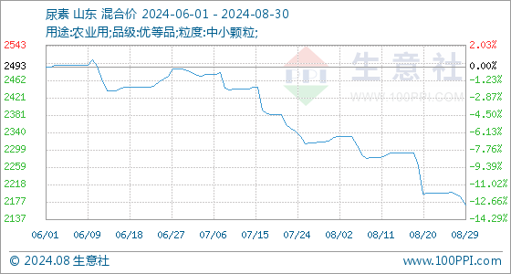 8月30日,生意社尿素基准价为2171.00元/吨,与本月初(2321.00元/吨)相比,下降了-6.46%。