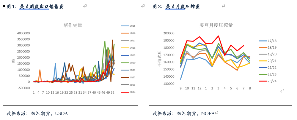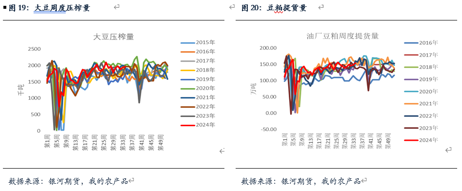 需求方面,整体来看,本月内美豆出口整体开始有好转迹象,虽然旧作仅仅在达标线附近波动,但新作采购进度明显加快,这一方面源于需求国缺口期逐步临近,另一方面也源于美豆下跌后市场竞争力的逐步体现。当前,美湾较巴西贴水普遍有10美分/左右的优势,引发了市场采购积极性的增加。可以看到,在过去的两周中,美豆周度出口销售量基本能维持在130-170万吨左右,略高于过去几年同期水平,但总量上来看,仍然偏慢,当前美豆新作共累积销售754万吨,仍处于历史同期偏低水平。