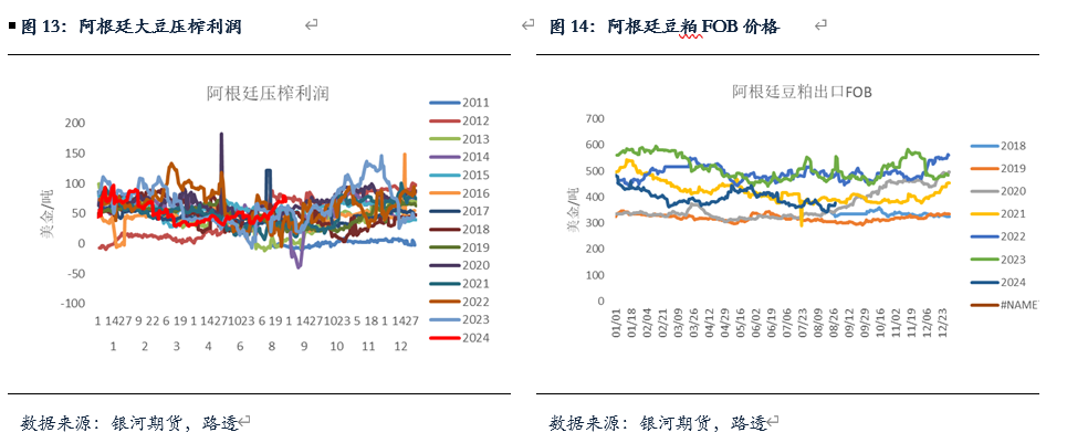 月内阿根廷农户销售整体维持稳定,但数量上有所减少,主要还是受到季节性因素的影响。受油籽加工厂工人罢工的影响,预计本月油厂压榨量将出现明显下滑,可以看到,本月内油厂压榨利润呈现明显走强,豆粕出口价格月内也呈现出一定的走强态势。