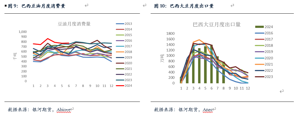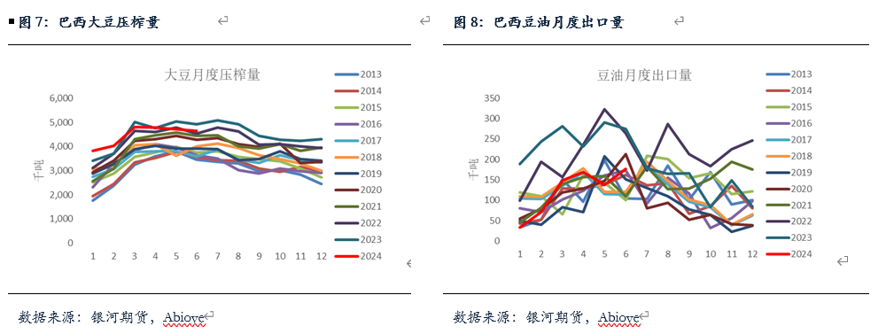从巴西的平衡表状况来看,年供应大概率会较上年度有所收紧,对于巴西产量这方面,各机构评估差异太大,部分机构认为巴西大豆产量将维持在1.5-1.6亿吨区间,甚至可能更高,但conab所给到的数据明显偏低,如果按照中性的1.53亿吨来评估,那么巴西豆的出口量仍然有可能达到9600万吨以上。今年巴西出口高于预期的主要原因在于压榨表现相对偏弱,从1-6月的累积压榨数据表现来看,巴西在此期间累积压榨量不增反减,这与巴西国内大豆压榨预期增加以及豆油总消费量的增加呈现明显反向。整体来看,巴西在此期间豆油消费和生柴消费表现都比较良好,上半年以来,巴西生柴消费同比增加约28.8%,豆油消费同比增加16.16%。但是,在此期间,巴西国内豆油出口量呈现明显下降,累积同比降幅达到51.25%,受此影响,巴西国内豆油总需求同比下降约2.19%,这可能是导致巴西压榨不及预期的主要原因。
