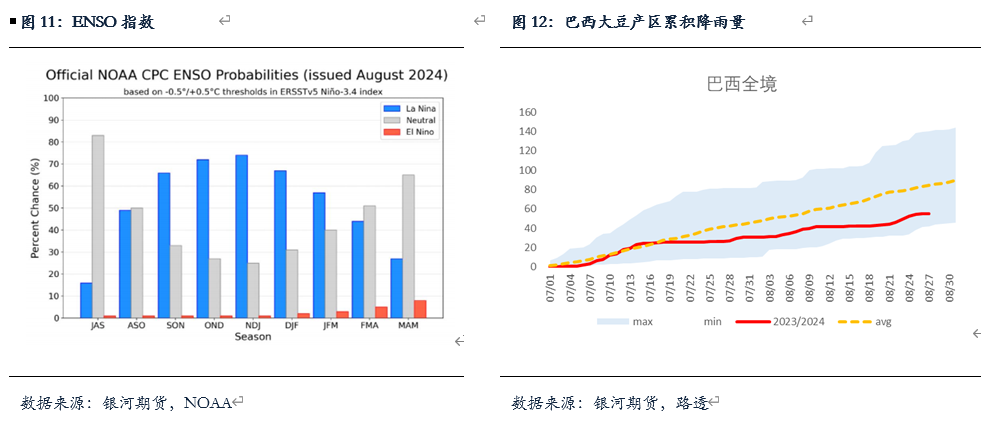 整体来看,今年9月期间巴西市场一方面需要关注旧作的供需收紧情况,另一方面也要关注新作的有关变化,整体来看,巴西今年大豆新作播种较过去时间预计有所提前,但是从近期气象模型来看,实际兑现难度仍然较大,当前巴西国内干旱程度仍然相对偏高,在未来几个月中拉尼娜强度会逐步增加,受此影响,巴西新作播种可能也会受到影响。