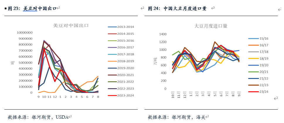 8月月度供需报告呈现深度利空,本次报告中,不仅把单产上调至53.2蒲式耳/英亩(前值52蒲式耳/英亩),更是把种植面积上调至8710万英亩(前值8610万英亩)。本次作物单产的上调整体符合预期,从天气变化以及作物优良率状况来看,未来可能仍有进一步上调的潜力。但是种植面积的上调确实存在很多超预期的成分,按照种植利润亏损的情况来看,一般种植面积通常容易出现一定的缩减,这可能是由于此前机构对种植面积本身评估过低。月中,profarmer调研结果给到了54.9蒲式耳/英亩的单产,虽然这可能与9月或者此后的单产存在差异,但也基本验证了今年大豆整体丰产的事实,受此影响,美豆在月内呈现加速回落。