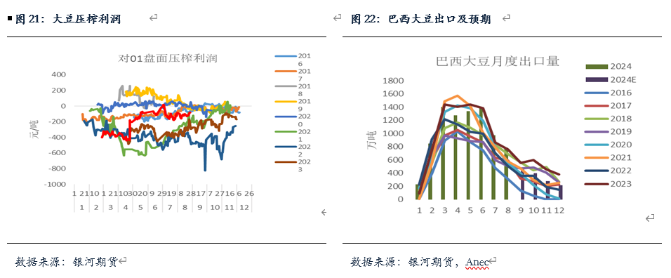 近期,国内采购9-11月船期的进度整体有所加快,尤其对美豆采购速度有所加快,但是仅从当前的买船进度来看,仍然相对偏慢,因此市场还是对后续的缺口存在担忧。在此可以进行一个简单的测算,如果巴西全年出口给到9600万吨,则10-1月后续的出口量大约在1094万吨左右,按照75%的量给到中国来看,能够给到中国的量大约在820.5万吨,考虑增量溢价采购的情况,仍有望达到900万吨以上。实际上,我们对中国11-2月压榨需求给到2990万吨,意味着在此期间中国对其他来源地的进口需求仍然要维持在2000万吨左右。剔除此前中国大豆的高库存以及其他来源地的可供进口量,我们预计对于美豆的需求可能仍然要维持在1600-1700万吨左右。其实,从历史数据来看,1600-1700万吨的目标量采购难度并不大,尤其在美豆丰产的大背景下。前期采购进度偏慢一方面是对不确定性的担忧,另一方面也是因为压榨利润持续不佳。最近一段时间来,大豆压榨利润持续改善,下游采购积极性也有所提高,在此背景下,预计9月及后续豆粕现货基差好转空间有限。