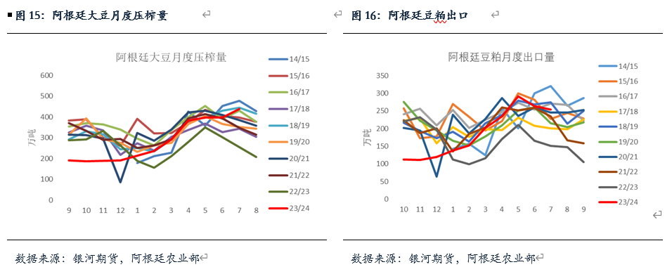 其实从年内阿根廷国内供需数据来看,年内供需两端均有所恢复,一方面,今年农户销售状况整体有所好转,另一方面,需求数据表现同样良好。数据显示,去年9月以来,阿根廷大豆累积压榨量311万吨,较去年同比增加约6.84%,如果考虑到8月份的压榨量,预计全年大豆压榨增幅将较去年进一步增加,并逐步接近历史正常水平,此外,从大豆出口数据来看,今年年初以来,阿根廷大豆出口量在353万吨左右,同比增加约325%,累积总需求维持在相对偏高水平。