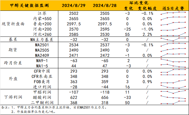 今日EG2501合约收盘价4759(+13),日内增仓7851手至30.21万手,EG9-1价差为-54(+9)。现货方面,现货主流围绕01合约-1左右商谈,下午MEG内盘重心震荡坚挺,市场交投一般,9月下期货基差在01合约升水14-15元/吨附近,商谈4777-4778元/吨,下午几单01合约升水12-14元/吨附近成交。华东主港地区MEG港口库存约68.14万吨(隆众资讯),相较上期去库0.28万吨;供给方面,乙二醇整体开工负荷上升至67.52%(+0.4pct),其中煤制乙二醇开工负荷66.21%(+2.06pct);需求方面,下游聚酯负荷为86.7%(-0.1pct);加弹、织造及印染的开机率维持增长,分别达到84%、69%和73%。江浙涤丝今日产销清淡,至下午3点半附近平均产销估算在3成略偏上;轻纺城市场总销量843万米(+96)。