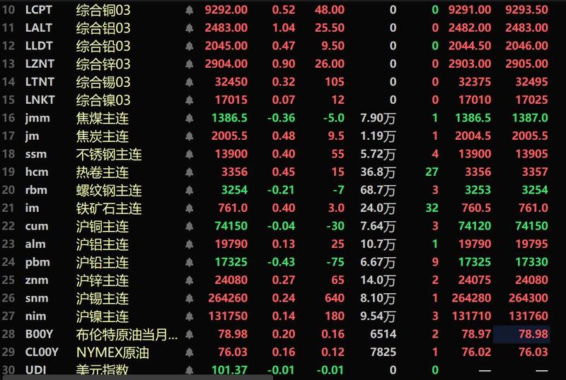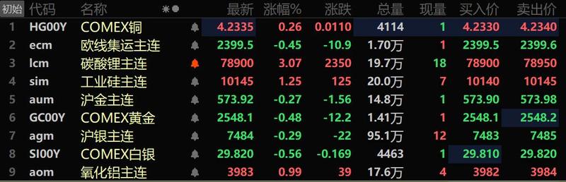 截至午间收盘,内盘基本金属普涨。沪锡涨0.24%。沪铜微跌,沪铝、沪锌和沪镍涨幅均在0.3%以内。沪铅跌0.43%。氧化铝主力期货涨0.99%。此外,工业硅主力合约延续前3个交易日的涨势继续涨1.25%。碳酸锂期货主力合约涨3.07%。