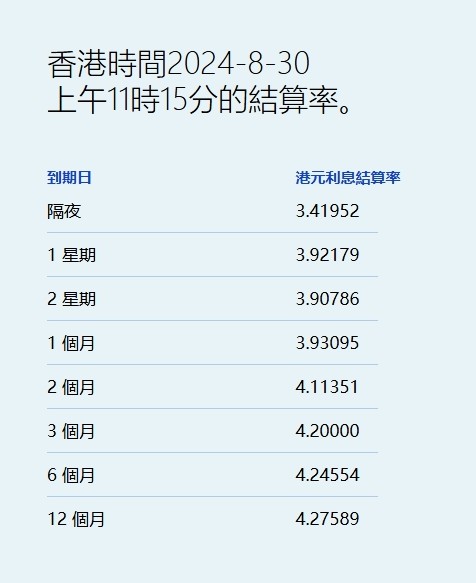 美联储下月大幅减息机会下降,港元拆息今日近乎全线上升,其中,隔夜息涨20基点至3.41952%,创逾一周新高,而与楼按相关的一个月拆息亦连升两天,报3.93095%,续见8月26日以来最高。反映银行资金成本的三个月拆息中止六连跌,升至4.2%,六个月略为回升至4.24554%,但一年期微跌至4.27589%。