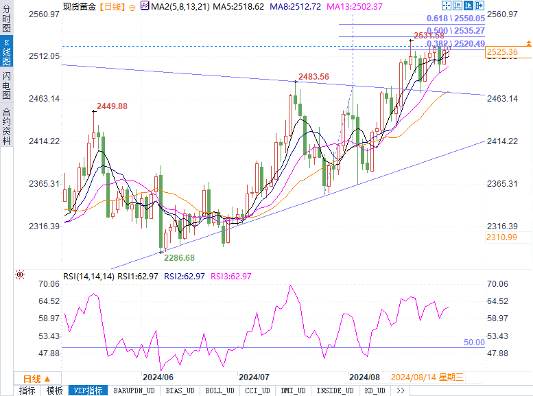 另一方面,如果金价跌破2500美元/盎司的支撑位,8月23日低点2485美元/盎司将成为下一个考验点。若跌破这一水平,金价可能会进一步下行至2470美元/盎司的支撑区域,这将对黄金多头构成更大压力。