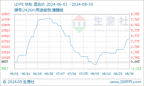 据生意社商品行情分析系统监测,LDPE(2426H)8月1日国内价格在9912元/吨,8月29日均价在10383元/吨,期间报价上涨4.75%。
