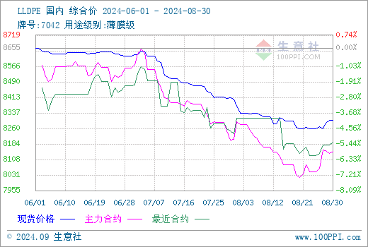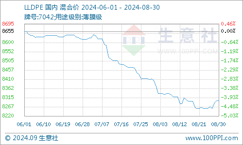 据生意社商品行情分析系统监测,LLDPE(7042)8月1日国内价格在8371元/吨,8月30日均价在8300元/吨,期间报价下跌0.85%。