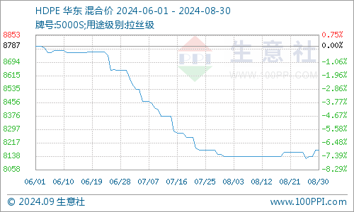 据生意社商品行情分析系统监测,HDPE(5000S)8月1日国内价格在8137元/吨,8月30日均价在8175元/吨,期间报价上涨0.46%。