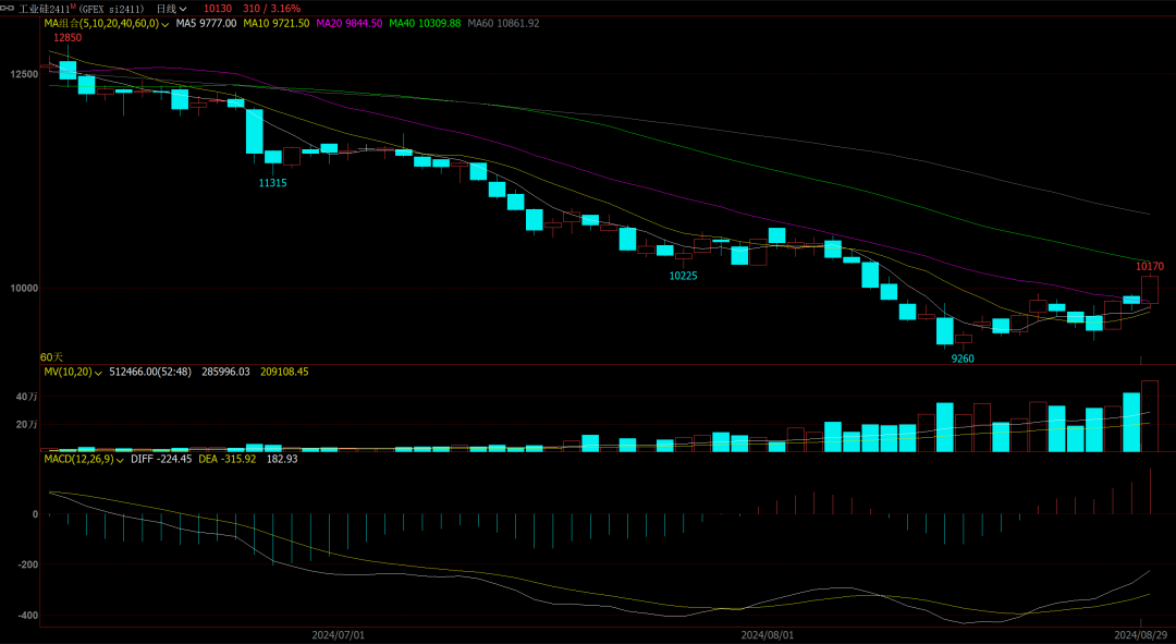 8月29日工业硅主力2411合约大幅走高,逐渐脱离历史低位,截止收盘报10130,涨幅3.16%。