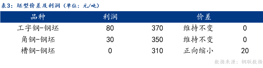 从坯型价差来看,工字钢、角钢与钢坯价差维持不变,槽钢与钢坯价差正向缩小。