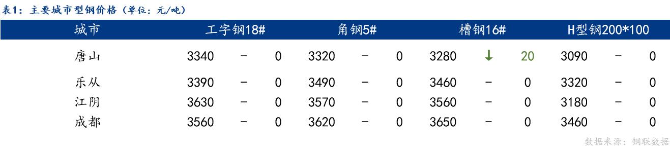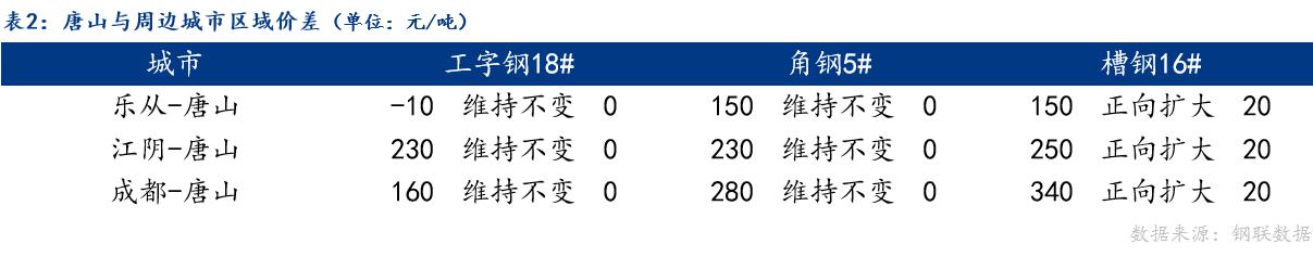 从区域价差来看,乐从工字钢、角钢,江阴工字钢、角钢,成都工字钢、角钢与唐山价差维持不变;乐从槽钢、江阴槽钢、成都槽钢与唐山价差正向扩大。