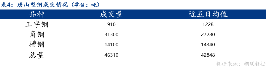 2、成交量为20家型钢厂当日成交,其中包括工字钢6家、角钢7家、槽钢7家。