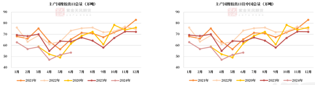 全球4大主产国(泰国、印尼、科特迪瓦、越南)2024年1-6月天然橡胶出口往中国总量同比下降29.99%;同比2022年下降11.20%。
