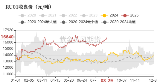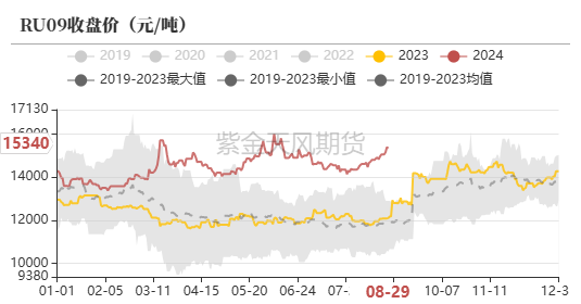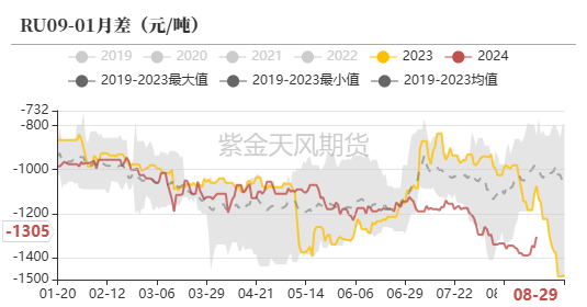 截至8月29日,RU09-01月差为-1305元/吨,环比上周上涨85元/吨。