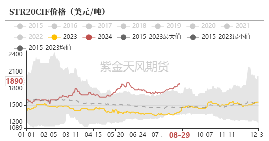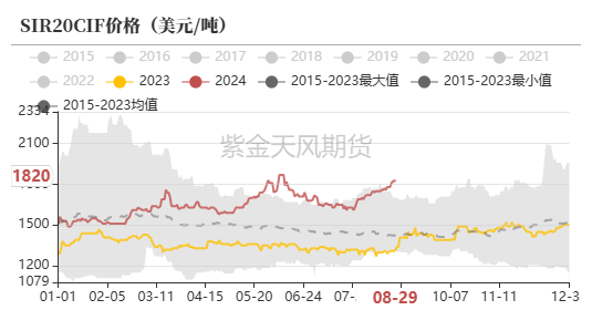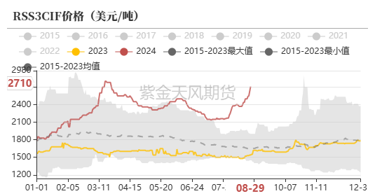 截至8月29日,RSS3烟片胶CIF价格为2710美元/吨,环比上周上涨210美元/吨。