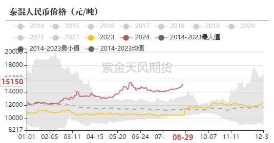 截至8月29日,泰混人民币现货为15150元/吨,环比上周上涨450元/吨。