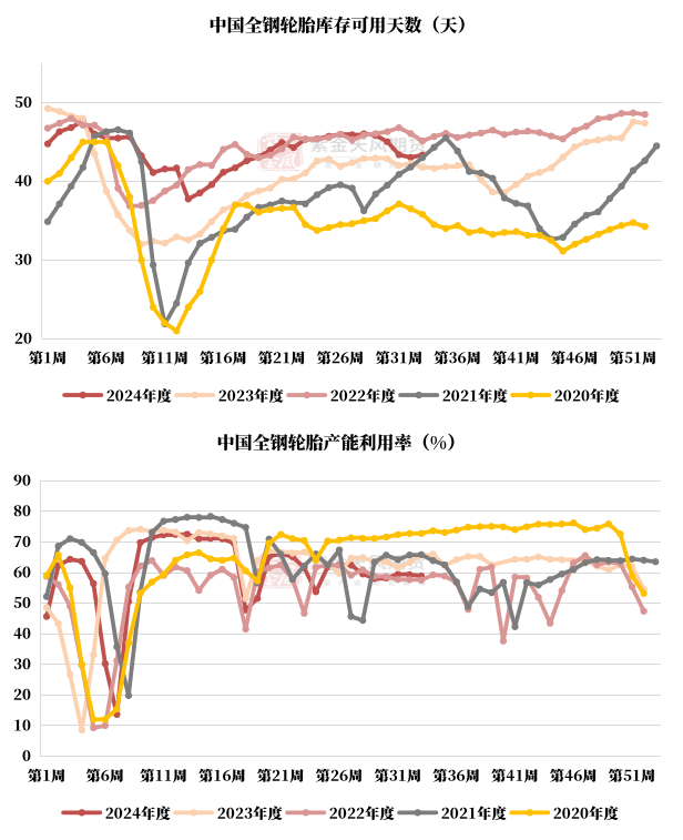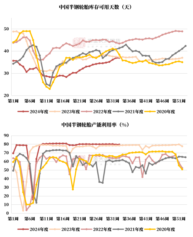 截至8月30日,中国半钢轮胎周度产能利用率环比微增。库存可用天数环比提升。