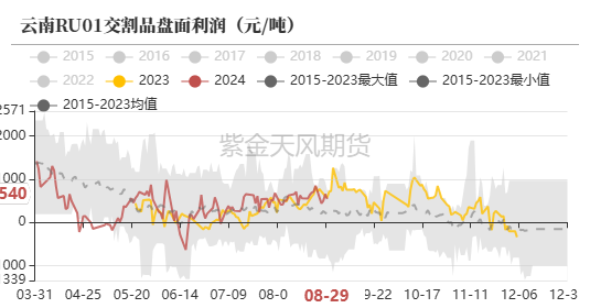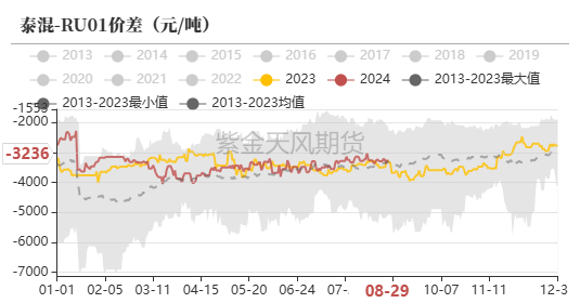 非标价差:中性泰混-RU01价差为-3236元/吨,位于均值附近。