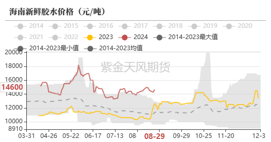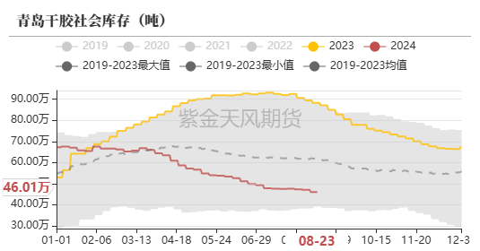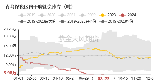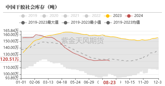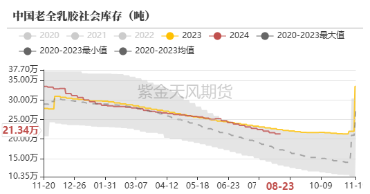 截至8月23日,中国全乳胶现货库存-3029吨,深色胶现货库存环比减少。
