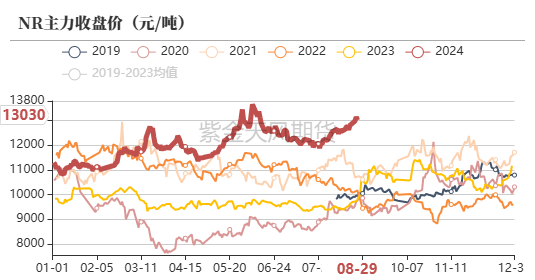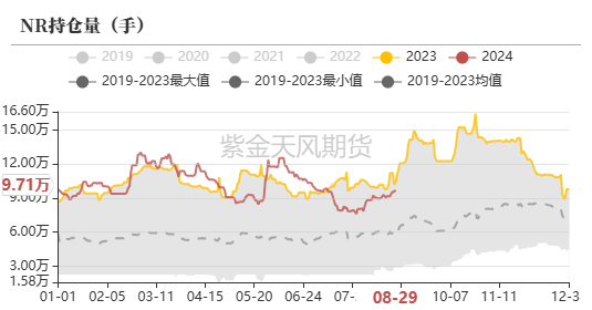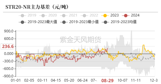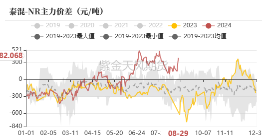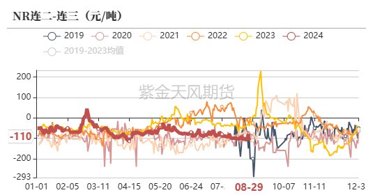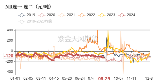 截至8月29日,NR连一-连二月差为-120元/吨,环比上周无变化;NR连二-连三月差为-110元/吨,环比上周下跌10元/吨。