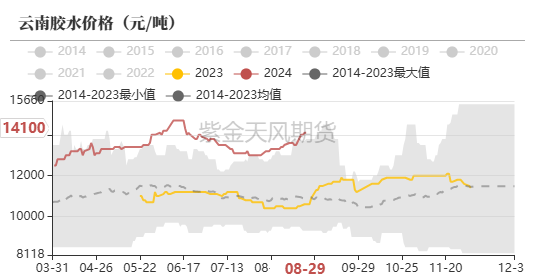 截至8月29日,浓乳胶价格为10500元/吨,环比上周上涨300元/吨。