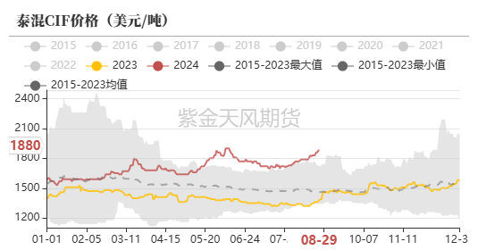 截至8月29日,泰混船货为1880美元/吨,环比上周上涨50美元/吨。